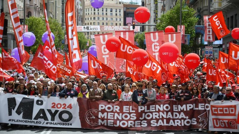 Mere end 70 demonstrationer fandt sted i spanske byer onsdag for at markere arbejdernes dag. Fagforeningerne Unión General de Trabajadores (UGT) og Comisiones Obreras (CCOO) var på gaden under sloganet »For fuld beskæftigelse: kortere arbejdsdag, bedre lønninger« for at bede regeringen om flere fremskridt på den politiske og sociale dagsorden.