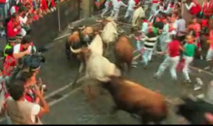 Hundredvis af unge stimlede sammen i gaderne klokken otte for at jage de seks kamptyre på deres vej gennem byen. Tyrene vil senere blive dræbt, og kødet vil serveret som en delikatesse på lokale restauranter i Pamplona.
