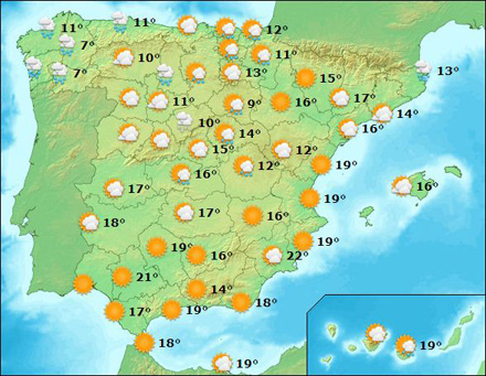 Der er udsigt til torden i Soria, La Rioja, Navarra, Huesca, Zaragoza, Teruel, Lérida, Gerona, Barcelona, Tarragona, Castellón, Valencia, Albacete, Ciudad Real, Cuenca, Guadalajara, Cáceres, Badajoz, Córdoba, Sevilla, Jaén, Huelva og Cádiz.