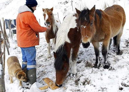 En ung landmand i byen Caneda i Cantabrien, giver brød til sine hopper, som er blevet mere eller mindre isoleret som følge af den sibiriske kulde