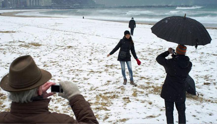 Denne vinterbader kunne minde lidt om en søvngænger eller en vildfaren Ole Lukøje... Her på stranden i La Concha de San Sebastián