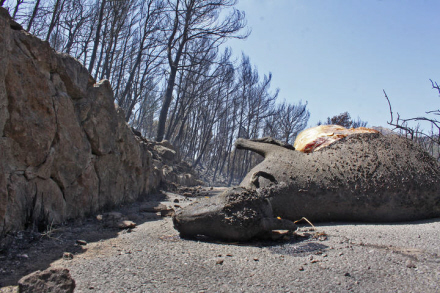 MA-10 landevejen er afspærret, hovedsageligt fordi et trådnet på klippen, som skal forhindre sten- og jordskred, er smeltet i branden.