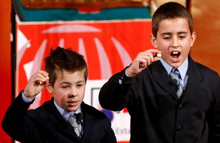 Eleverne fra Colegio de San Ildefonso. Til venstre Iván Quintero, der viser og synger nummeret 79.250 og til højre Andreas López, der synger ”3 milliones de euros” og viser kuglen med 'El Gordo.'
