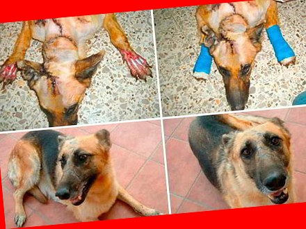 Hunden havde store sår på ryggen og på benene, og måtte gennem en lang række operationer, før den igen kom til hægterne.