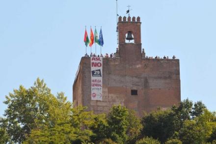 To fagforeningsaktivister, som gav sig ud for at være turister, placerede i morges to kæmpe strejke-bannere på facaden til det mauriske bygningsværk Alhambra i Granada.