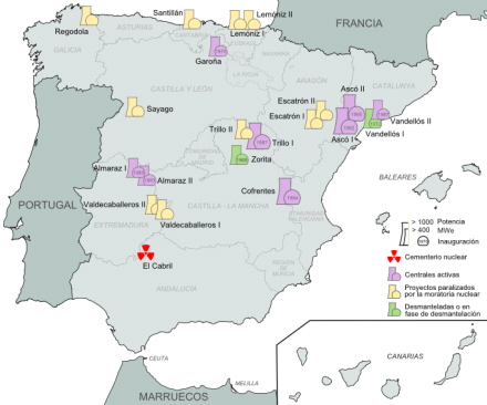 Spanien har i dag otte atomkraftanlæg – hvoraf et er ved at blive nedlagt -, et atomaffaldslager i Córdoba og et produktionsanlæg til nukleart brændsel i Salamanca.