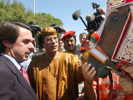 Den spanske premierminister gik endog så vidt, som til at kalde Gaddafi for en ven og forærede ham spanske fuldblodsheste.
