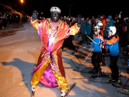 Festlig stemning i skisportstedet Sierra Nevada ved Granada med Kong Baltazar på ski