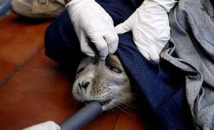 Dyrlæger hjælper den afkræftede sælunge med at spise