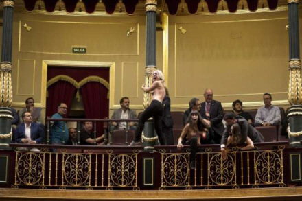 Normalt er der en lidt støvet stemning i det spanske parlament, men der kom lidt liv i det hele onsdag, da tre kvinder fra smed tøjet og råbte slagord ad justitsministeren.