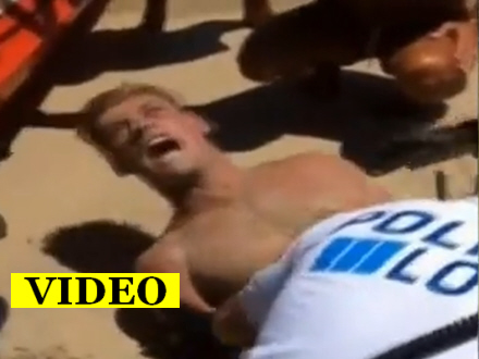 Turist forsøgte at bide adskillige strandgæster, og der skulle ikke mindre end 11 betjente til at arrestere den vanvittige mand. Myndighederne tror, at han har taget livsfarligt 'kannibal-narko', som er i omløb på spanske ferieøer.