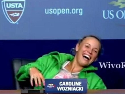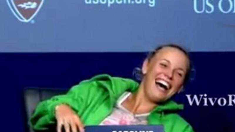 Wozniacki lod sig falde bagover i smerte. Hun morede sig kosteligt, og det samme gjorde journalisterne.