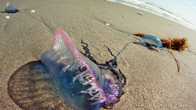 Selv når goplerne skyller ind på land, kan de stadig være giftige, hvis man kommer i berøring med dem. Ved allergiske tilfælde skal man omgående søge lægehjælp.