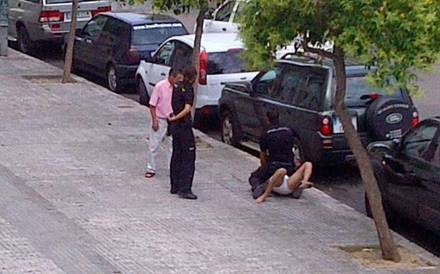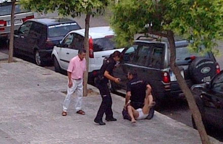 Da politiet mandag formiddag ankom til stedet, løb den 37-årige forvirret og halvnøgen rundt i gaderne i Palma de Mallorca. Manden blev tilbageholdt og for at holde ham stille, satte en af betjentene sig oven på brystet af ham. Her blev han så siddende, selv om manden forsøgte at sætte sig til modværge ved at sparke med arme og ben.