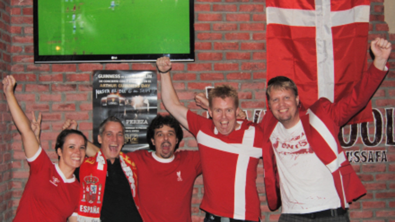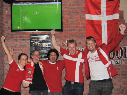 Der blev jublet over Danmarks to mål i EM-kvalifikationskampen Danmark-Norge tirsdag aften, da en lille gruppe fodboldglade danskere var mødt op på Liverpool Russafa Sport Bar i Calle Sueca i Valencia.