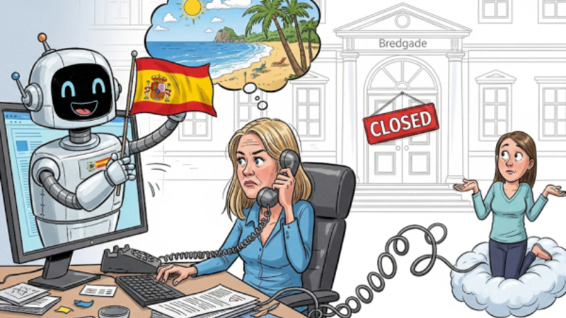 Jeg skriver første gang til kontoret den 11. august og foreslår tre forskellige dage for interview. Tre dage senere har jeg endnu ikke fået svar, så jeg forsøger at ringe, men efter at have ventet på personlig betjening i nogle minutter, bliver opkaldet afbrudt. Det prøver jeg et par gange, men med samme resultat. Den automatiske telefonsvarer foreslår dog inden afbrydelsen, at jeg skal gå ind på deres hjemmeside og eventuelt udfylde en kontaktformular. Men her popper bare en AI-robot op på spansk og fylder halvdelen af skærmen. Jeg kan ikke se nogen kontaktformular - den gemmer sig måske bag robotten? Det er umuligt at vide, for jeg kan ikke slippe af med robotten - heller ikke selvom jeg beder den om at skride! På flere sprog!