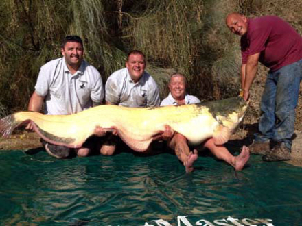 Efter en halv times kamp kunne en udmattet Bernie Campbell med lidt hjælp trække sit livs fangst i land. En 93,4 kilo tung og 2,4 meter lang europæisk albino-malle, der nær havde trukket fiskeren i vandet flere gange.