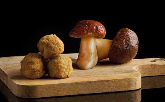 Boletus-kroketter. Og når jeg siger boletus, mener jeg enhver form for velsmagende svamp. Og vi kan bruge naturlige eller dehydrerede svampe - som vi selvfølgelig hydrerer på forhånd. Svits først de finthakkede svampe i smørret, til de er færdige, og tilsæt så melet og derefter mælken til bechamelsaucen. Svampene er i bechamelen hele tiden og giver den en vidunderlig smag.