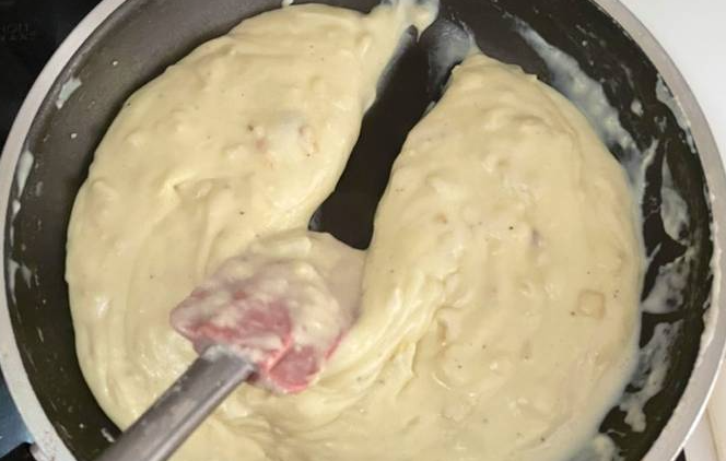 For at sikre, at dejen hverken er hård eller blød, skal vi tilberede den helt rigtigt. Som vi forklarer i vores videoen i vores grundopskrift, skal den tilberedes, indtil den let løsner sig fra pandens sider, når vi bevæger den med en træske, eller hvis vi kører skeen langs pandens bund, så den laver en bane, der gør, at vi kan se bunden.