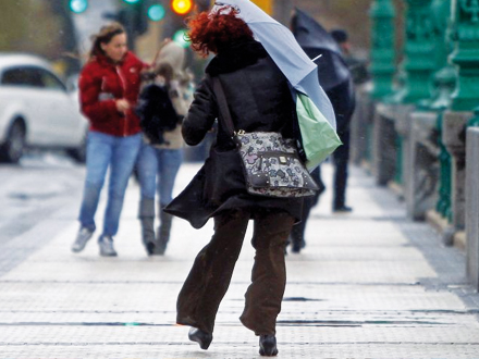 Fodgængere krydser en bro mens de kæmper mod kraftig sidevind