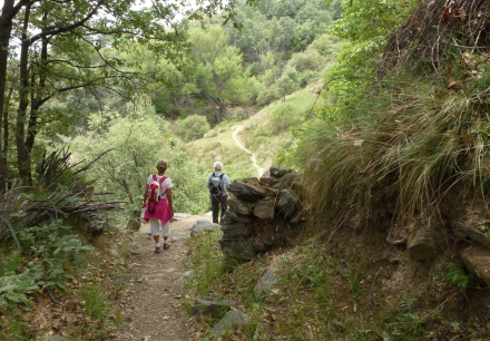 Men nu går det sydover ad en gammel muldyr-sti, der atter går langs kløften forbi adskillige forladte små-gårde, for hvem gider i dag bo i en ejendom, man kun kan komme til med muldyr eller til fods?