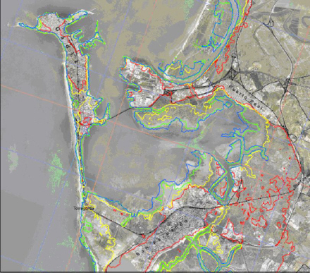 Kort over maksimal oversvømmelse for bugten i Cadiz. Linjerne repræsenterer følgende: blå = minimum vandlinje ved lavvande, grøn = mest sandsynlige linje ved lavvande, gul = mest sandsynlige vandlinje ved højvande og rød = maksimum vandlinje ved højvande.