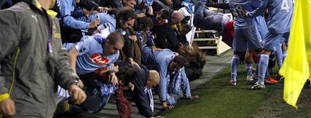 De vilde tilskuere vælter ned fra tribunen og ud på banen. Flere kom til skade