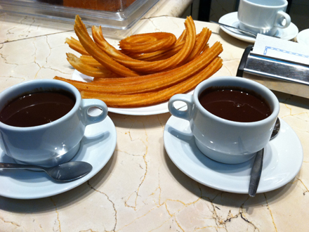 Ingen tidlig morgen uden 'churros' og varm chokolade. Den flydende brøddej presses ud gennem en dyse og direkte ned i fritureolien i én lang bane. Derefter klippes de i stykker på ca. 20 centimeter og serveres.