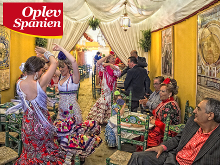 Under den åbne himmel er stemningen lige så intens som indendørs. Ryttere iført stramme bukser, støvler og bredskyggede hatte rider gennem området sammen med deres bagsæde-passagerer; kvinder i farvestrålende flamenco-kjoler.