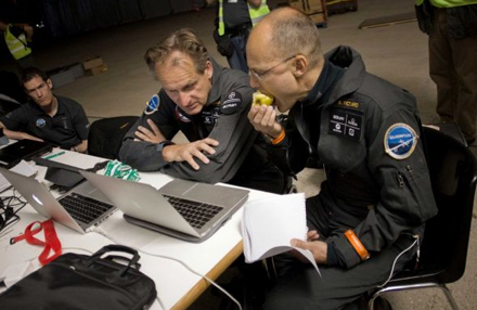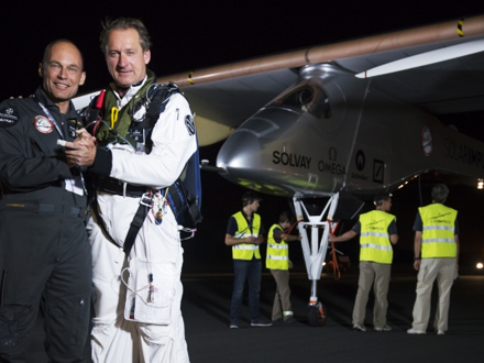 Sent tirsdag aften landede Solar Impulse planmæssigt i lufthavnen i Rabat. Her blev Piccard modtaget af sin partner på projektet, Andre Borschberg, samt lederen af det marokkanske solcelle-agentur, Mustafa Bakkoury.