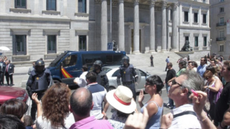 Utilfredsheden med regeringens nye sparerunde fik i går omkring 300 funktionærer fra de omkringliggende offentlige kontorer til at samles foran Kongressen i Madrid. Akkompagneret af strejkende minearbejde blev der råbt slagord mod landets regering og konservative premierminister, Mariano Rajoy, som til sidst måtte snige sig ud af gennem bagdøren til Calle Zorrilla, i stedet for at gå ud gennem hovedindgangen til La Carrera de San Jerónimo, som han normalt bruger.