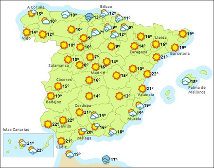 Madrid får i dag skyfrit vejr med mellem otte – 20 grader, Barcelona letskyet 12 – 20, Valencia letskyet 12 – 20 og Málaga letskyet 15 – 22 grader.