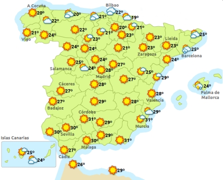 I Madrid er det i dag letskyet, og der kan komme en smule nedbør. Mellem 18 og 30 grader. I Barcelona overskyet med torden og byger og 21 til 24 grader, Valencia får tiltagende skydække og efterhånden mulighed for regn med 23 til 30 grader, Málaga har fortsat solrigt vejr med 21 til 31 grader.
