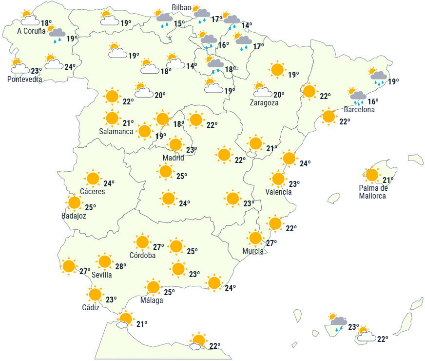 På resten af halvøen og De Baleariske Øer vil der overvejende være letskyet eller helt klart vejr, men efterhånden kan der komme flere skyer, og det giver mulighed for enkelte byger i bjergområder i indlandet.