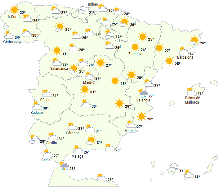 Der forventes et næsten generelt fald i dagstemperaturerne bortset fra i Galicien og på De Kanariske Øer, hvor der ikke forventes nogen ændringer. Alligevel overskrider vi 35 grader på De Kanariske Øer og den sydlige halvdel af den atlantiske side af fastlandet - endda 38 grader i dalene og omkring 35 grader i det nordlige højland, det sydlige Galicien, østlige Cantábrico og Ebro-dalen.