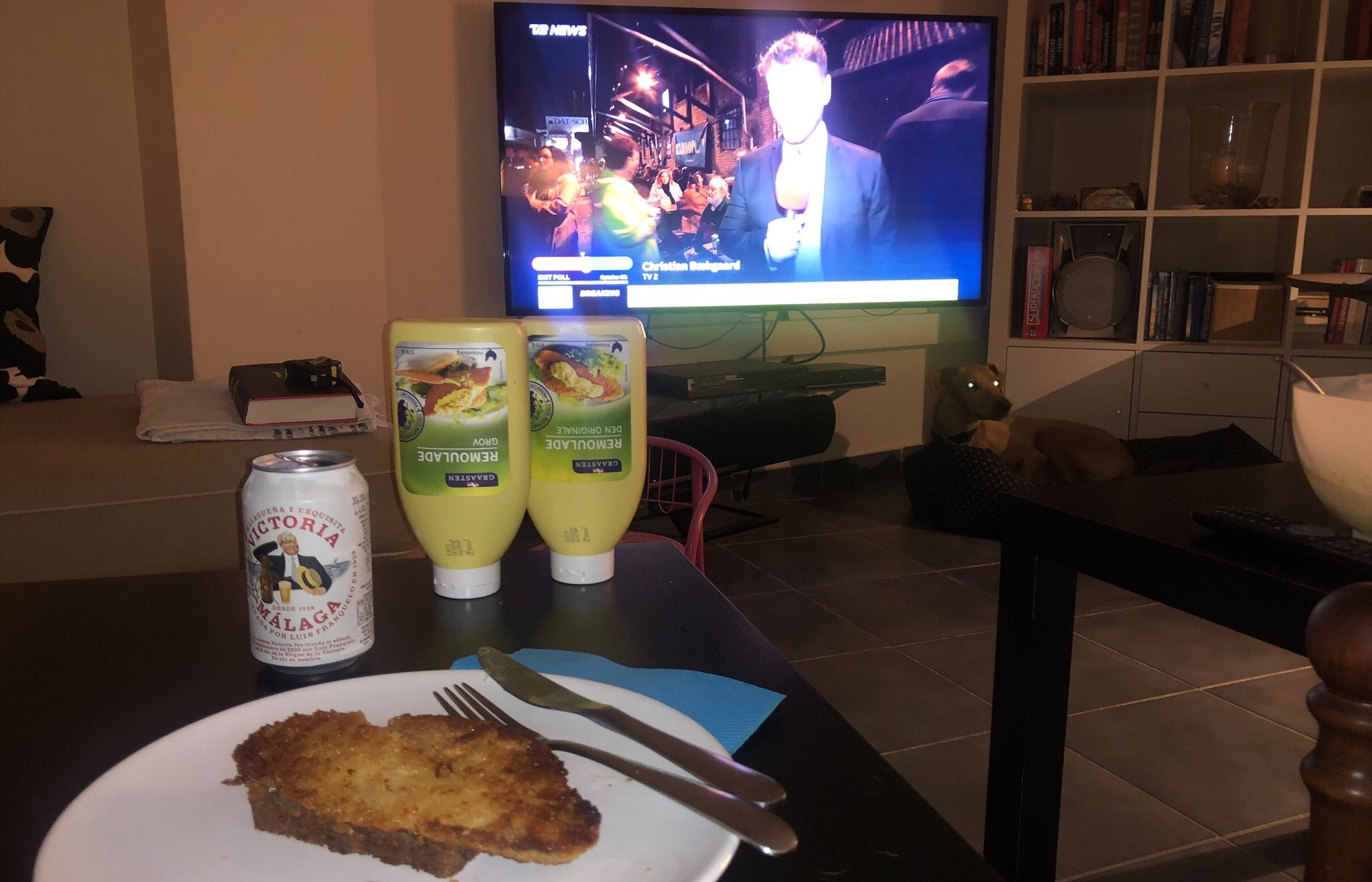 Derfor var det også helt oplagt, at vi holdt valgaften sammen akkompagneret til en jævn strøm af rugbrød, sild, ål, fiskefilet, karrysalat og remoulade - også den grove. Og så startede vi naturligvis med at skåle på et godt valgresultat i cava.
