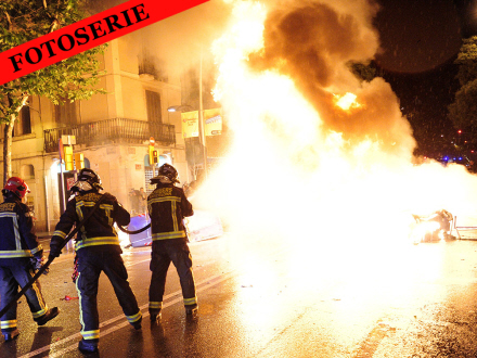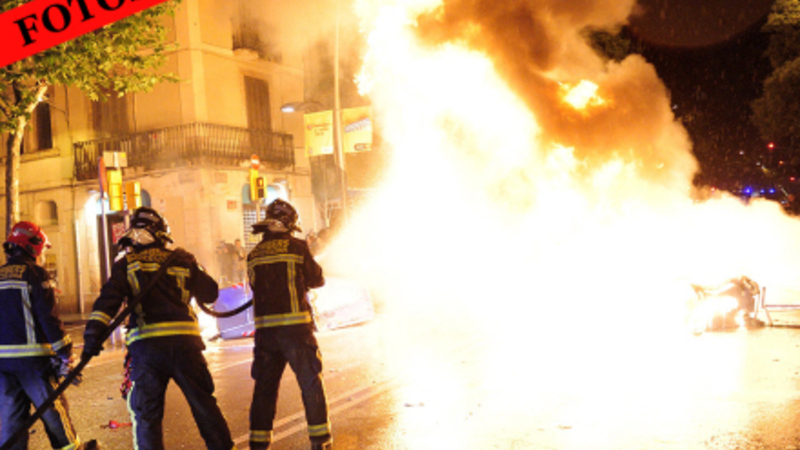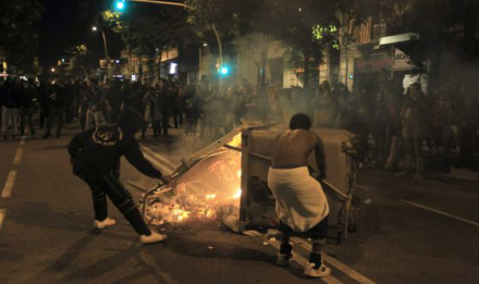 I forstadskvarteret El Sants blev 20 personer i går anholdt af urobetjente, da demonstranter satte ild til containere og ødelagde facader på flere banker i området.