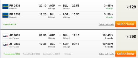En hurtig søgning på momondo.com viser, at Ryanairs pris på Málaga - Billund tur/retur koster under halvdelen af den næstbilligste med AirFrance. Dog skal du lige huske på, at de mange, mange, mange gebyrer ikke er inkluderet i de 129 euro. Den reelle pris ender på 144,16 euro. Men så har jeg heller ikke købt bagage.