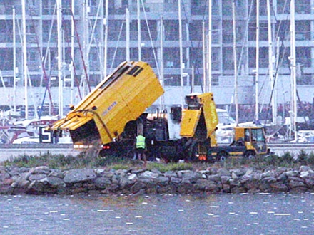 Fiskeskipper Francisco Gómez fra den spanske fiskerbåd ”Divina Providencia” har taget fotos af to renovationsvogne, som læsser affaldet direkte ned i havet – mindre end en halv sømil fra den spanske fiskezone.