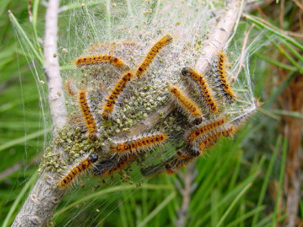Processions-larver starter livet i træerne, hvor de spinder et stort, hvidt net i grenene.