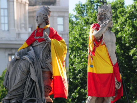 Med spaniernes sans for at fejre selv mindre sejre, er det allerede besluttet, at der mandag aften skal være fest for det spanske landshold på La Plaza de Cibeles i Madrid. På billedet ses guderne Cibeles og Neptun, da de var klædt på til at modtage VM-mestrene i 2010.