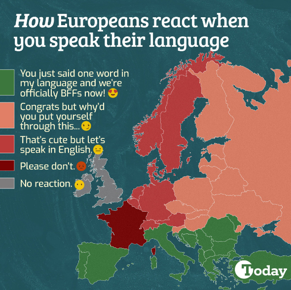 Men i Norge, Sverige, Danmark og Tyskland siger de måske, at det er fint, men kan vi ‘please just speak English’, og i Frankrig kræver det perfektion, hvis du skal tale fransk - intet mindre kan gøre det!