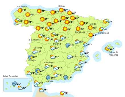 Málaga får temperaturer på mellem 20 og 26 grader, og noget af et regnskyl hen mod aftenen. De lokale myndigheder har hævet alarmberedskabet til gul.