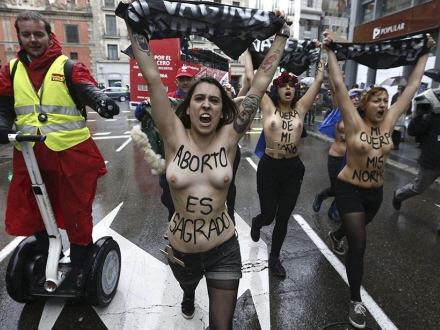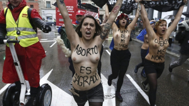 De fem kvinder fra den feministiske bevægelse Femen blev anholdt, efter de søndag forsøgte at afbryde en lovlig anti-abort demonstration i Madrid.