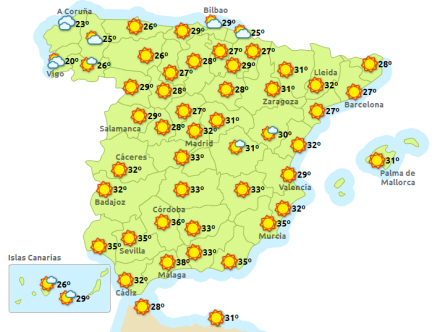 I Madrid er det i dag mest solrigt og mellem 19 og 34 grader, Barcelona får for en gangs skyld også solrigt vejr med mellem 22 og 29 grader, Valencia solrigt og mellem 23 og 33 grader, og Málaga ligeledes solrigt og 23 til 33 grader.