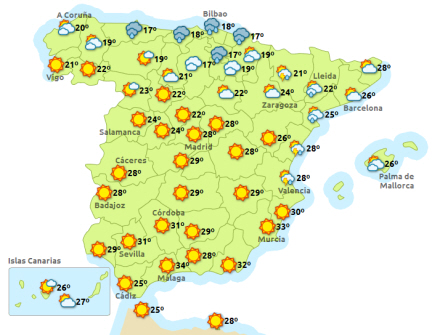 Madrid har i dag solrigt vejr med 19 til 34 grader, Barcelona, letskyet og 21 – 26 grader, Valencia får tiltagende skydække og mellem 21 – 31 og Málaga med en del sol og 22 – 37 grader.