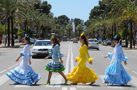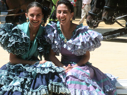 Den spraglede påklædning forvandler feria-pladsen til en gigantisk farvepalet. Kjolerne kommer i alle mulige nuancer, mønstre og former. Men også tilbehøret er afgørende. Store øreringe, hårspænder eller armbånd - alt kan bruges, så længe det passer til kjolerne.