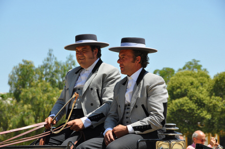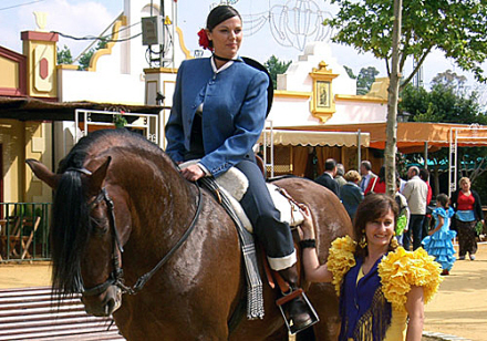 Jerez de la Frontera i Cádiz Provinsen holder hvert år en vidunderlig folkefest til ære for heste og ryttere. Rytteren rider langsomt gennem feria-pladsen på vej hen til et af foreningslokalerne med sin smukke bagsæde-passager. Hun er iført en gul sevillanas-kjole med mønstre, store gule øreringe og et blomsterformet hårspænde, der matcher perfekt til kjolen.