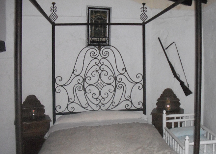 Den øverste etage, forbundet med et trappe med høje trin og lavt til loftet, findes et spartansk soveværelse med det klassiske jagtgevær på væggen.