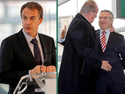 Ved ankomsten til Valencia: Til venstre José Luis Zapatero på talerstolen og til højre giver den folkekære Kong Juan Carlos Udviklingsminister, José Blanco, en odentlig krammer